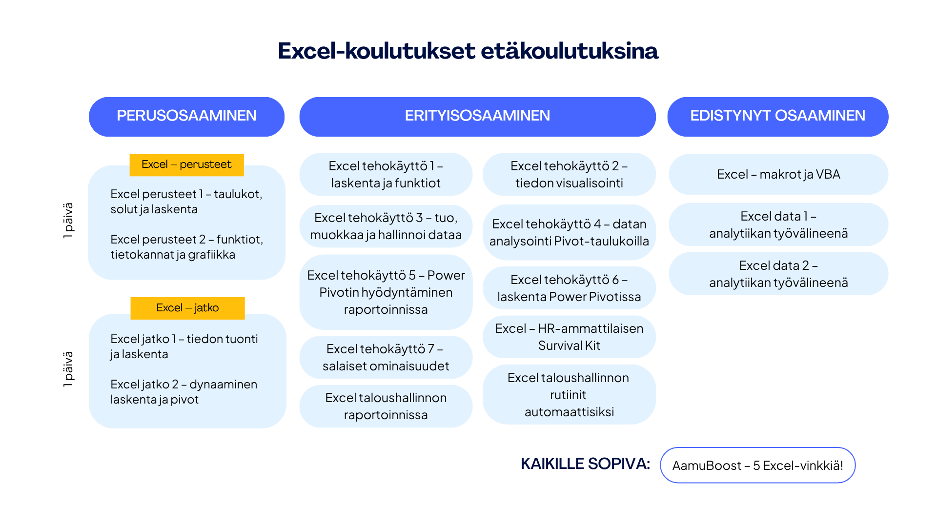 Suosittelemme tutustumaan Excel-koulutuksien opintopolkuun, joka auttaa sinua hahmottamaan, mitä muita taitoja voit kehittää!